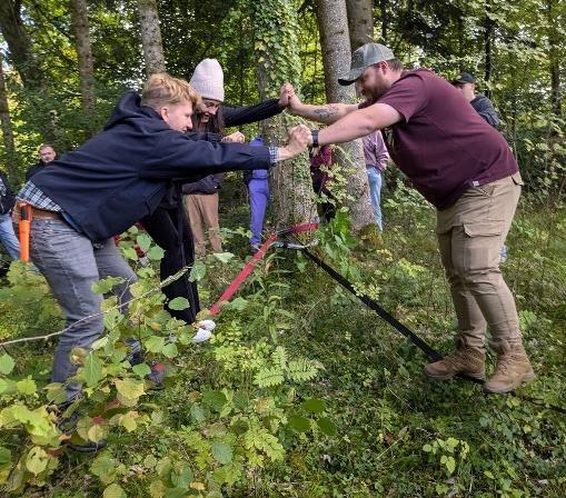 Anschließend lernten die Teilnehmer die Wildnis intensiver kennen, indem sie die heimische Flora und Fauna erkundeten und bei einem Erlebnisspiel ihre Orientierung im Gelände unter Beweis stellten. Hierbei musste die Gruppe Hinweise im Wald finden, was sowohl die Zusammenarbeit als auch die Achtsamkeit förderte. Neben dem praktischen Naturerleben stand immer auch der achtsame Umgang mit der Umwelt im Vordergrund, was die Teilnehmenden sensibilisierte.