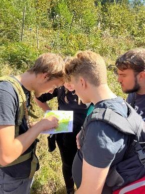 Das war die erste Hütte, doch die zweite folgt sogleich. Wir machten uns also auf den Weg – aber wohin? Gegeben waren nur Entfernung und Richtung. Wir nordeten die Karte, maßen unser Ziel aus und machten uns auf den Weg in die hoffentlich richtige Richtung. Eine Spannung lag in der Gruppe, aber wir waren zuversichtlich. Nach einigen Kilometern schien die Karte plötzlich nicht mehr zu stimmen, wir änderten die Richtung und fanden den richtigen Pfad abseits der Wege, quasi „Querwaldein“. Das waren mehr als zwei Schritte in der Wildnis. Schließlich wurden wir mit dem Erreichen der ersten Station belohnt und erfreuten uns einer neuen Aufgabe: Ein Gruppenbild mit Zweien in der Luft, zwei roten und zwei grünen Gegenstände.
