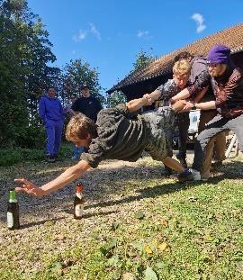 Am frühen Morgen wurden die Feuer in den Öfen entfacht, so wird der Gemeinschaftsraum gewärmt, und in der Küche verströmte der Kaffee einen angenehmen Duft. Am Tag spielten wir Kooperationsspiele: Wir befreiten einen Ball mit Schaschlikspießen aus einem Turm, balancierten Nägel aufeinander und traten gegeneinander an. Ein epischer Kampf begann, es galt eine Flasche, von einer Linie ausgehend, so weit wie möglich zu platzieren. Die Gruppen halten eine Person fest, welche sich mit dem Oberkörper bis ganz dicht über den Boden lehnt, um die Flasche vor sich zu platzieren und anschließend mit einem Schwung wieder aufgerichtet zu werden. Wir waren höchst gespannt und probierten vieles aus, um jede Taktik zu erproben. Am Ende stand die Flasche 2 Meter von der Linie entfernt, ohne dass je einer die Linie überschritten hat.