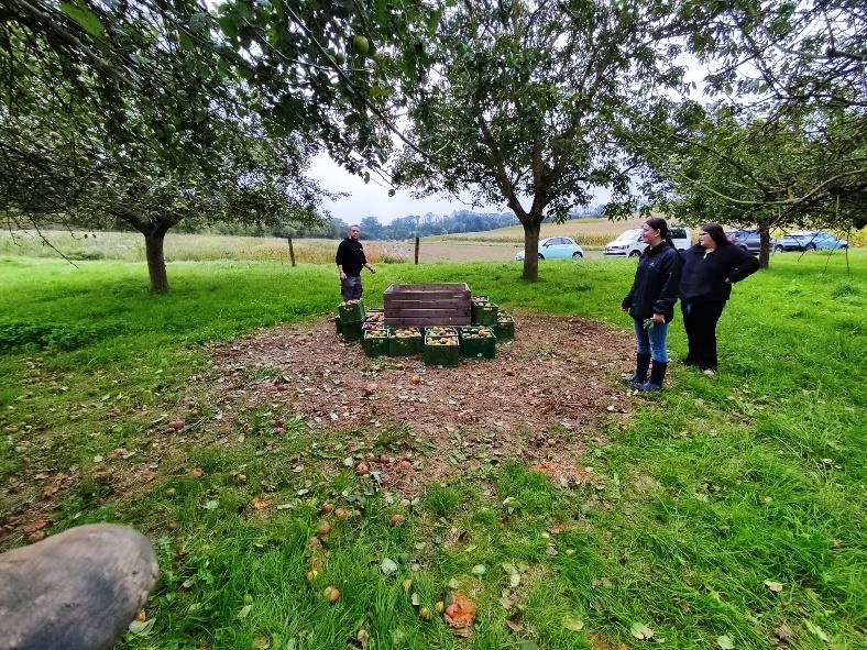 Bei einem ausführlichen Rundgang haben wir den Markushof kennengelernt. Herr Richter hat uns als Gründungsmitglied von Solawi allerlei Details gezeigt und uns aus der Historie des Hofes Anekdotisches berichten können. Besonders der Kuhstall und die zahlreichen Kühen hatte es uns angetan. Auf den Streuobstwiesen des Hofes haben wir anschließend viele Körbe Äpfel gesammelt, die in folgenden Ta gen zu Apfelsaft für die Mitglieder verarbeitet wurden. Wir werden als Dankeschön noch ein paar Fla schen Saft erhalten.