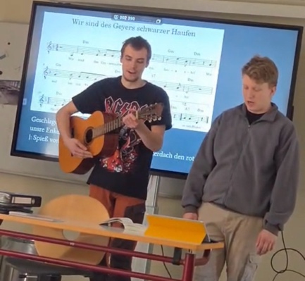 Am Mittwoch begannen wir in Kleingruppen den Leistungsnachweis für das Seminar vorzubereiten. In dem Leistungsnachweis beschäftigte sich jede Gruppe mit einem Musikgenre / Musikstil und entwickelte eine anschauliche Präsentation, die wir am Donnerstag vor der Klasse vorstellten.